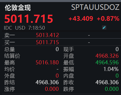 涨超1%!现货黄金重回5000美元