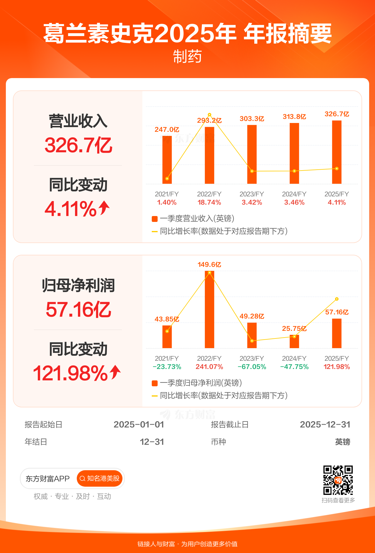 葛兰素史克2月4日发布年报业绩,截至2025年12月31日的12个月内,该公司营业收入326.67亿英镑,同比增长4.11%;公司权益持有人应占溢利(归母净利润)57.16亿英镑,同比增长121.98%。