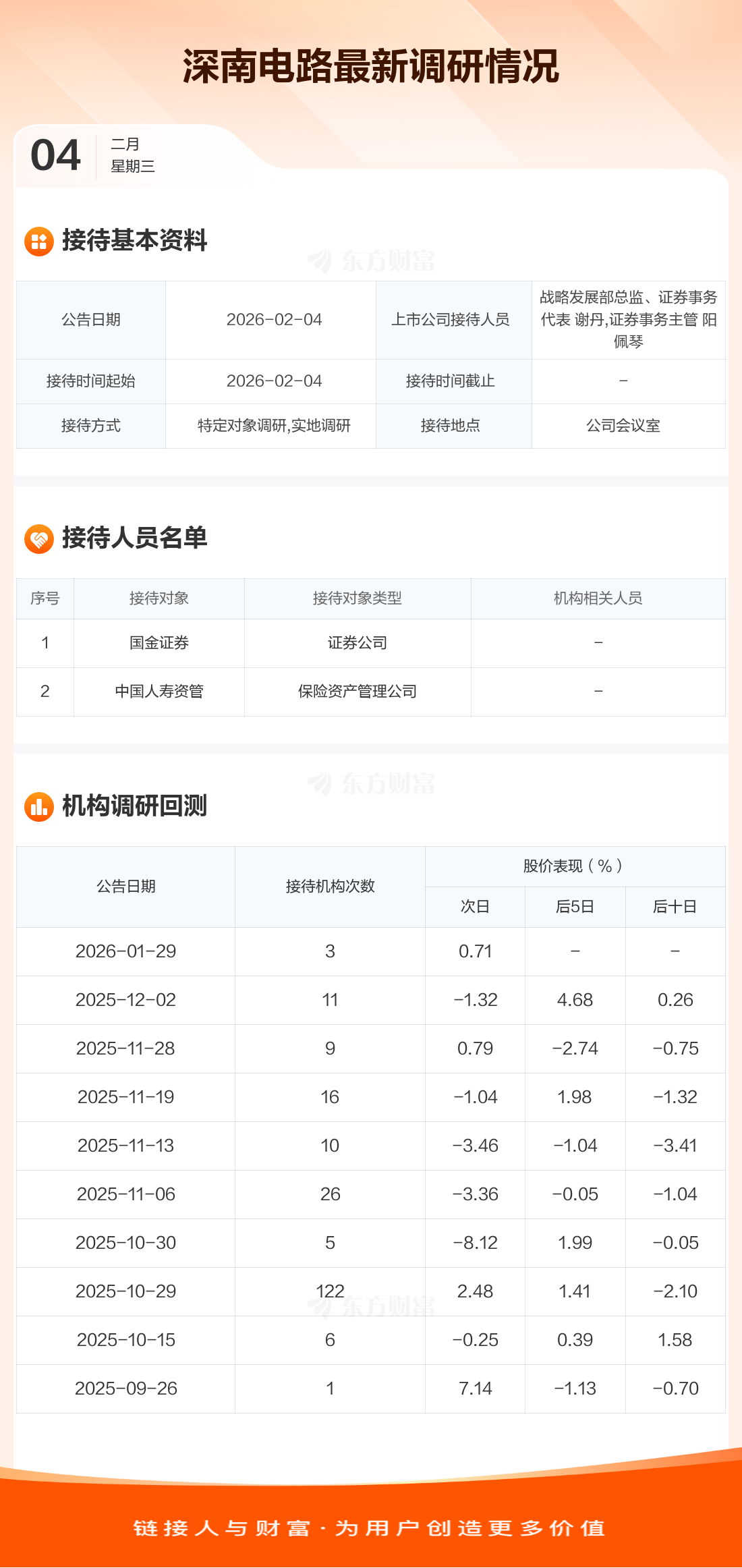 深南电路2月4日公告称,2月4日接待国金证券等2家机构调研。接待人员包括战略发展部总监、证券事务代表 谢丹,证券事务主管 阳佩琴。