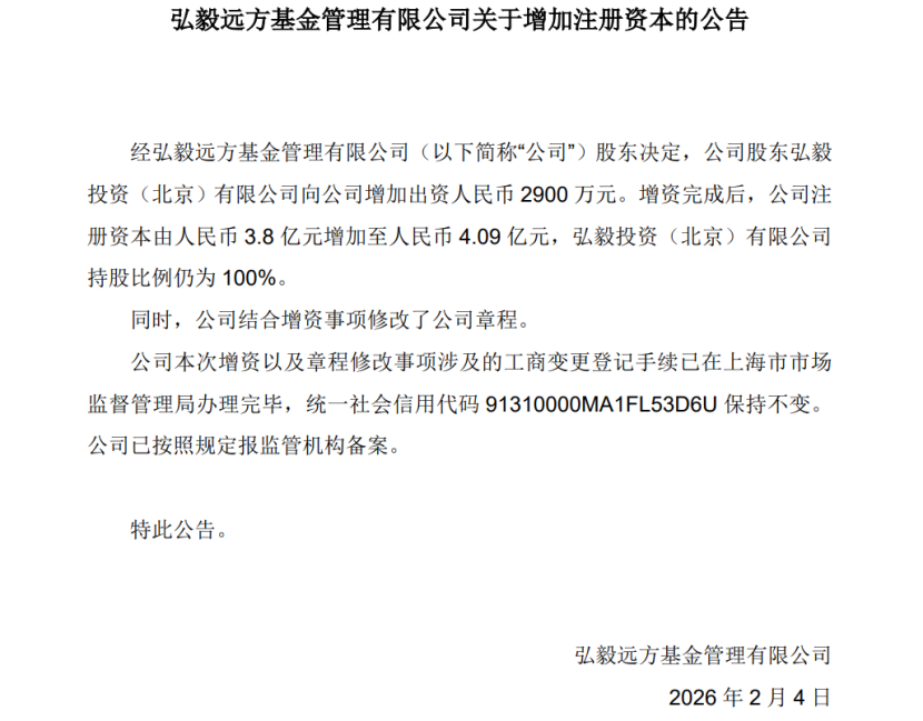 2月4日,弘毅远方基金宣布进行新一轮增资。这既是2026年以来首个公募增资案例,也是弘毅远方基金成立8年以来的第七次增资,成为中小公募频繁“输血”的最新注脚。