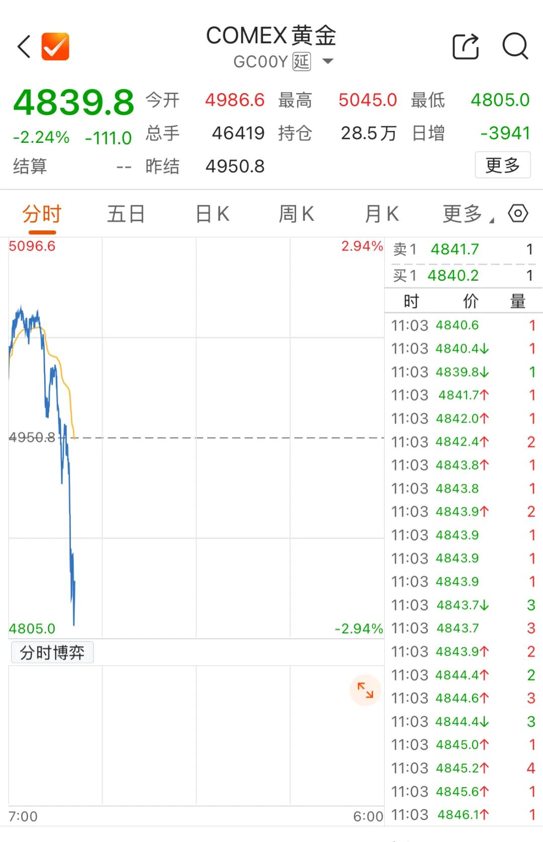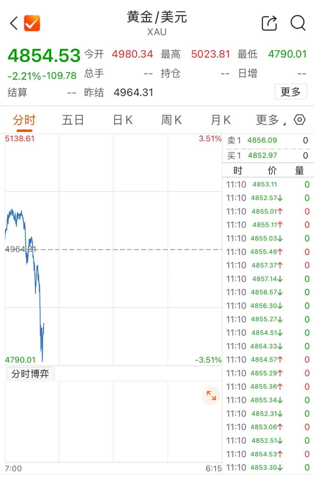 现货黄金一度跌破4800美元/盎司,日内跌幅超3%。截至发稿,其跌幅收窄至2.21%,报4854.53美元/盎司。COMEX黄金跌超2%。