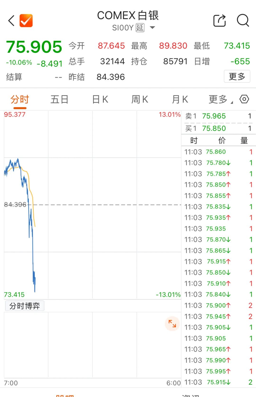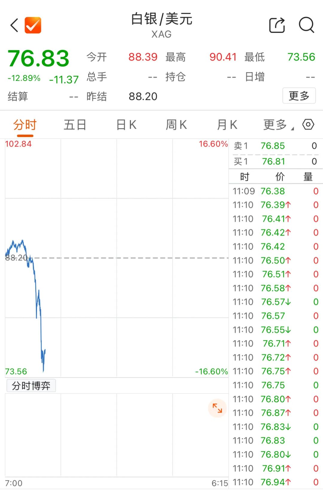 早间,现货白银直线跳水,一度暴跌超16%。截至发稿,其跌幅略有收窄,报76.83美元/盎司。COMEX白银跌超10%。