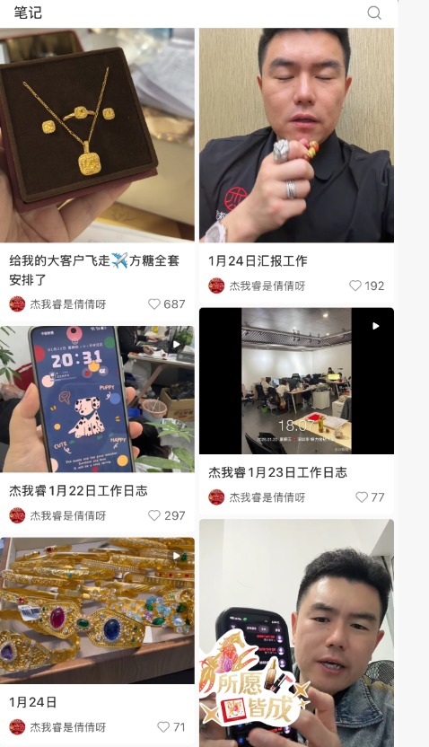 但真正引爆流量,还是近年的事情。当整个水贝市场还在收取工费时,杰我睿推出了“免工费”活动,从而击中了一批对价格敏感的用户,客户数量激增。线上账号矩阵也随之铺开,据统计,杰我睿运营矩阵除了创始人主账号,还包括“杰我睿真疼人”“杰我睿好疼人”等近10个辅助账号。