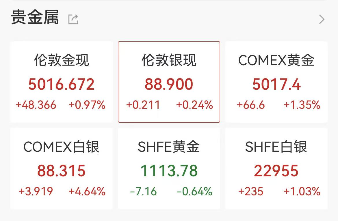 现货黄金、白银反弹集体飘红,黄金直线上升重回5000美元