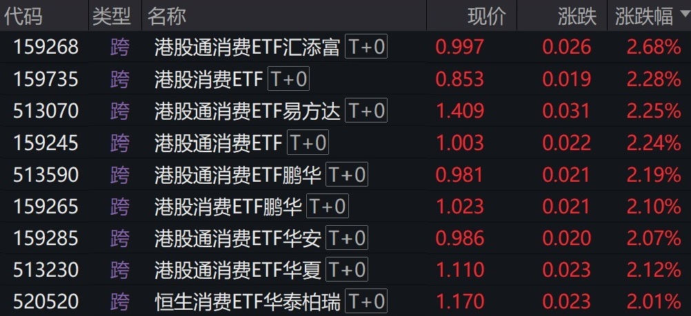 受盘面影响,港股消费相关ETF涨超2%。