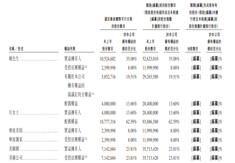 股权方面,姚哲男直接持有35.08%的股份,其妻子汪洋直接持有13.60%的股份。姚哲男还通过宁波美则持有8%的股份。此外,代理股东通过投票代理安排授予姚哲男19.51%的股权。姚哲男夫妇合计控制公司股东会76.19%的投票权。