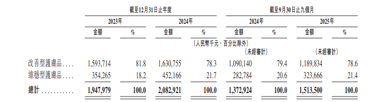 具体来看,公司收入主要源自“”改善型护肤品“与”维稳型护肤品“两大产品。其中,报告期内,”改善型护肤品营收规模分别为15.94亿元、16.31亿元及11.90亿元,占公司总营收比重稳定维持在78.3%-81.8%区间,持续构成公司营收的核心支柱。