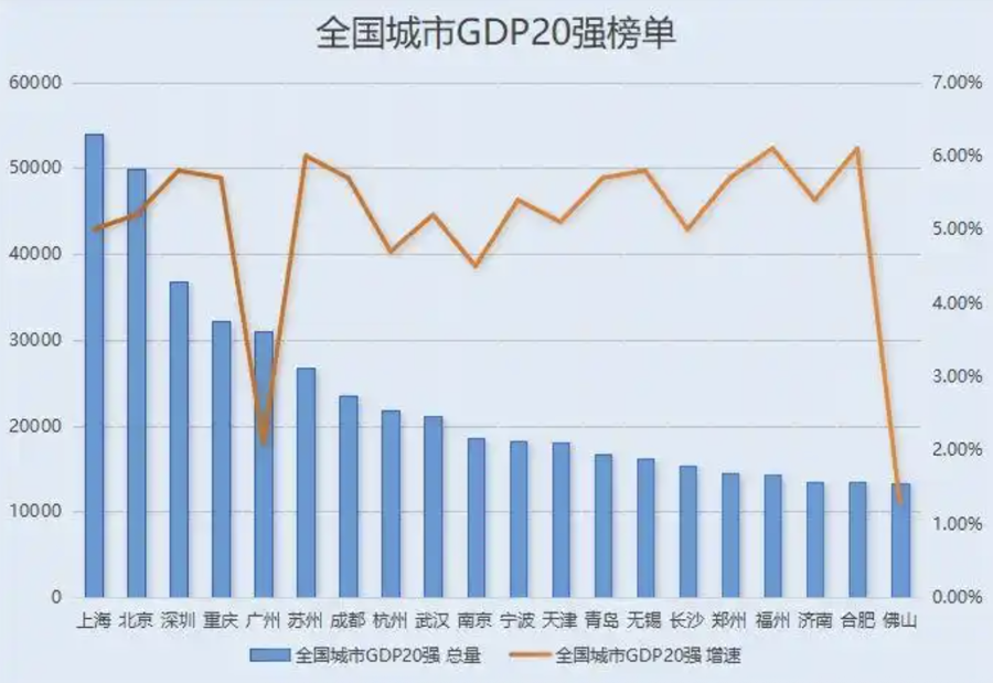 从经济总量看,上榜城市形成了清晰的四个梯队:上海和北京独占5万亿级的第一梯队;深圳、重庆、广州构成了3万亿级的第二梯队;苏州、成都、杭州、武汉组成了2万亿级的第三梯队;其余城市则位于1万亿级,构成了阵容最为庞大的第四梯队。