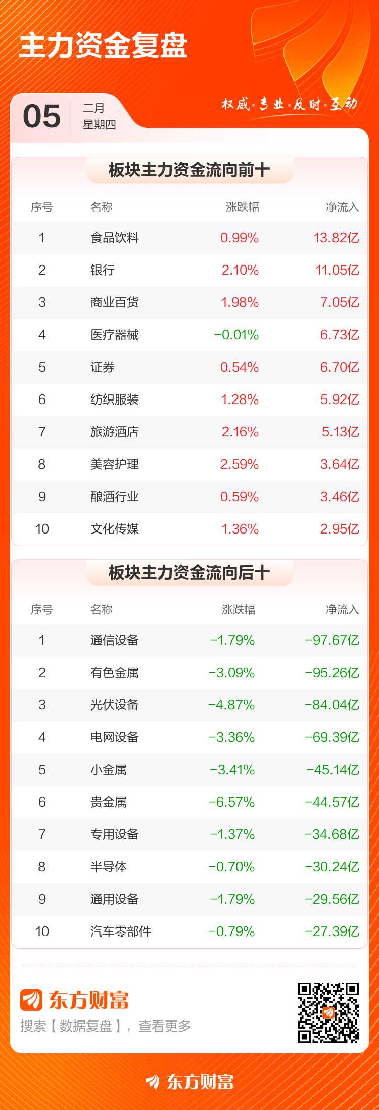 2月5日,沪指跌0.64%,深成指跌1.44%,创业板指跌1.55%。两市成交额2.18万亿,较上个交易日缩量3048亿。数据显示,今日大盘主力资金净流出836.62亿。食品饮料、银行、商业百货等板块主力资金流入排名居前,其中食品饮料净流入13.82亿元。