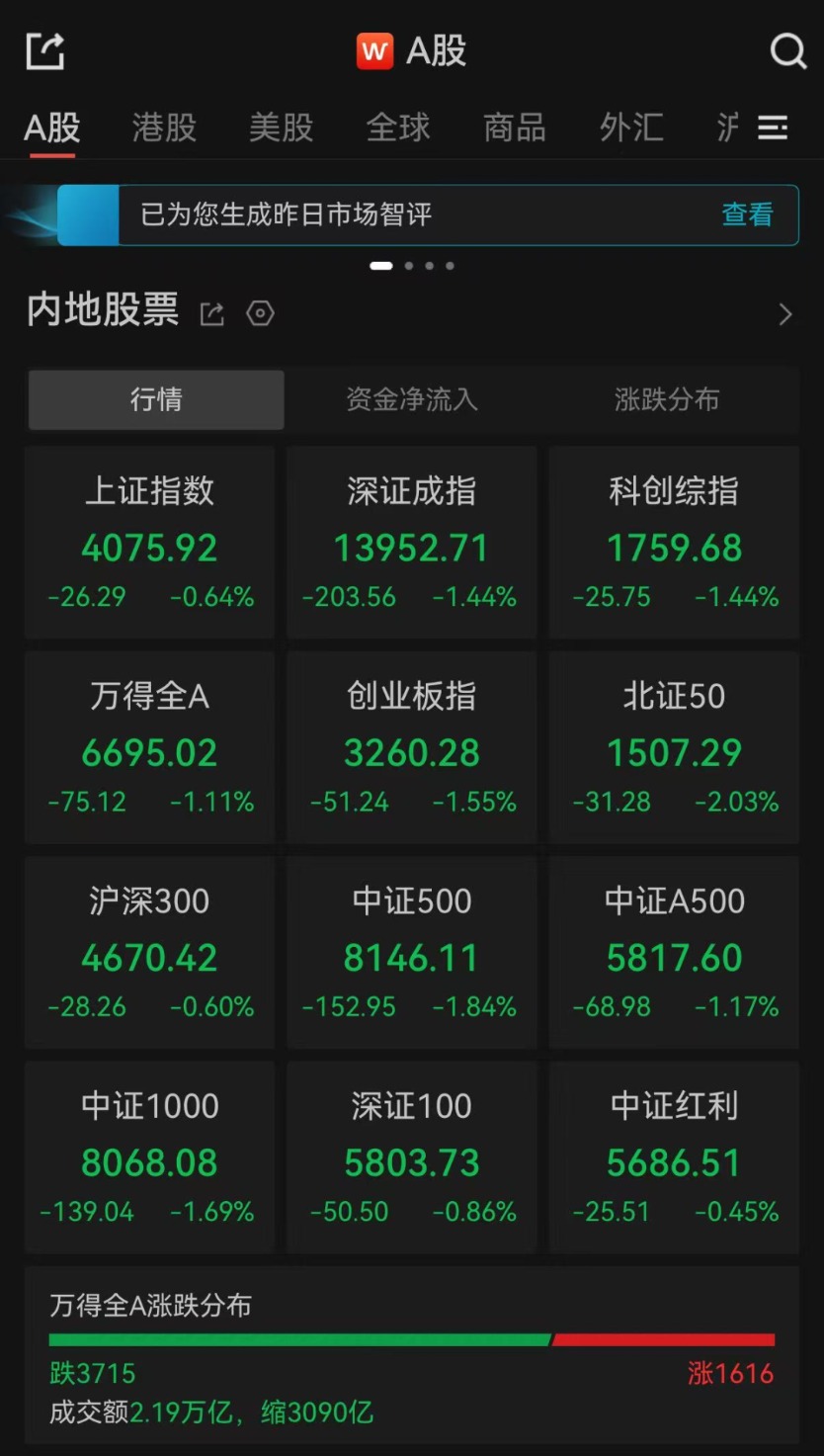 2月5日,A股三大指数低开,全天震荡调整。截至收盘,沪指跌0.64%,深证成指跌1.44%,创业板指跌1.55%。全市成交额2.19万亿,超3700只个股下跌。