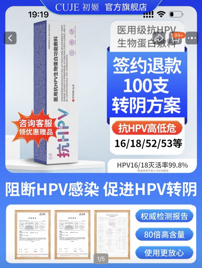 某电商平台的CUJE初姬旗舰店销售的医用抗HPV生物蛋白功能敷料也给出了类似承诺。宣称产品“阻断HPV感染促进HPV转阴”,并承诺“签约退款 100支转阴方案”,在不同套餐选项上还分别标注“180天内累计使用105支,未转阴,0元续用”“需联系客服备案登记,登记型号未转阴,凭检查报告,全额退款”等内容。