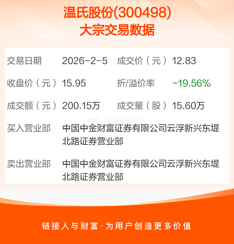 2026年2月5日,温氏股份发生1笔大宗交易,共成交15.60万股,成交金额200.15万元。