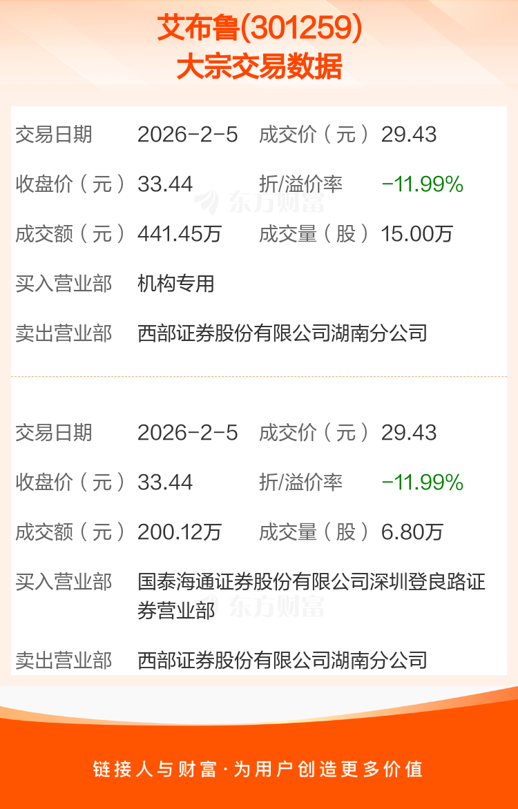 2026年2月5日,艾布鲁发生2笔大宗交易,共成交21.80万股,成交金额641.57万元,占其流通市值比例为0.19%。