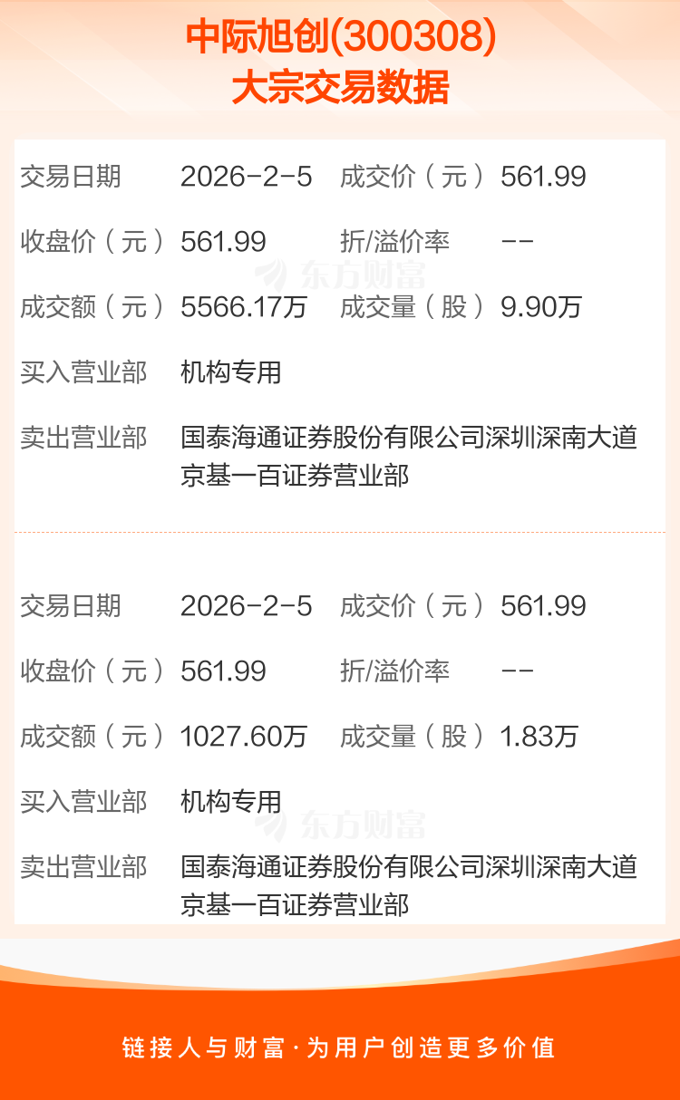 2026年2月5日,中际旭创发生2笔大宗交易,共成交11.73万股,成交金额6593.77万元,占其流通市值比例为0.01%。