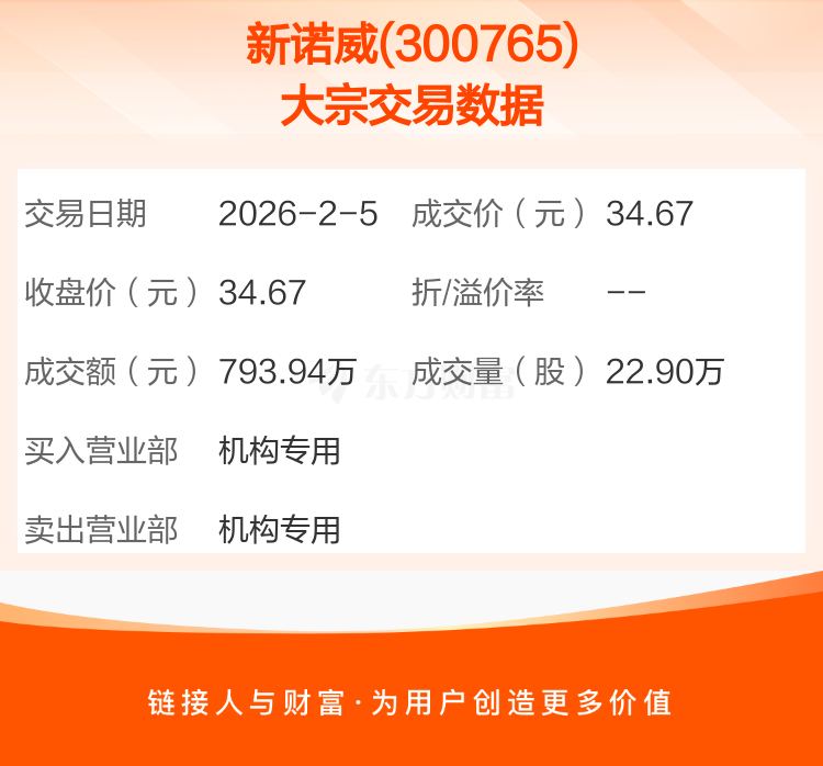 2026年2月5日,新诺威发生1笔大宗交易,共成交22.90万股,成交金额793.94万元,占其流通市值比例为0.02%。