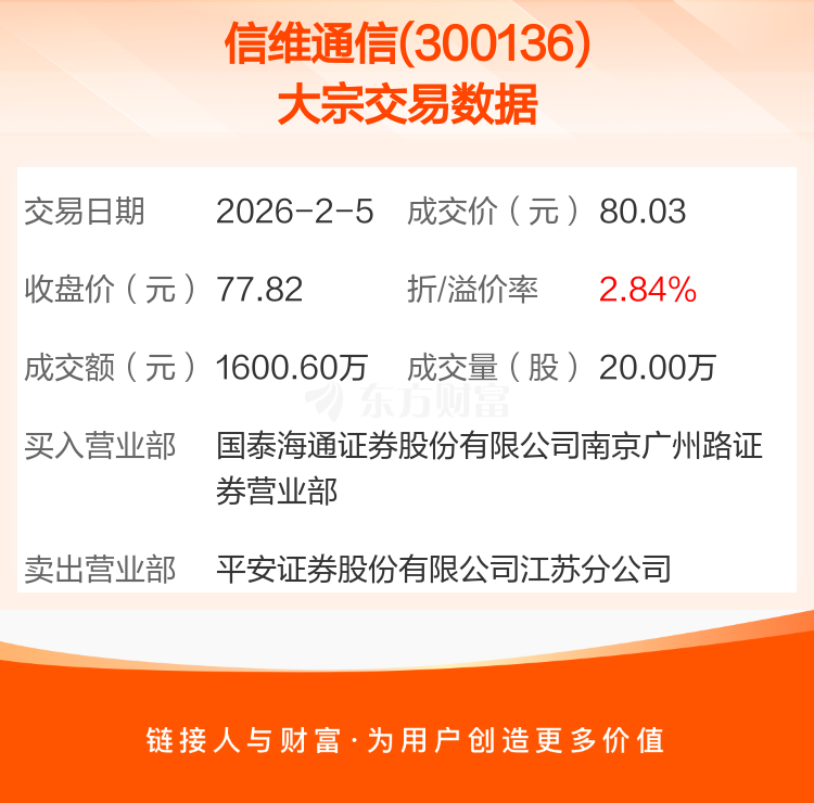 2026年2月5日,信维通信发生1笔大宗交易,共成交20.00万股,成交金额1600.60万元,占其流通市值比例为0.02%。
