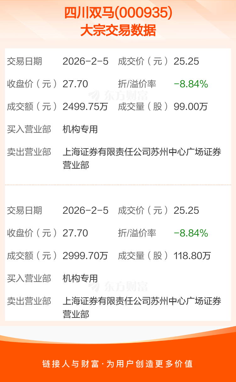 2026年2月5日,四川双马发生2笔大宗交易,共成交217.80万股,成交金额5499.45万元,占其流通市值比例为0.26%。