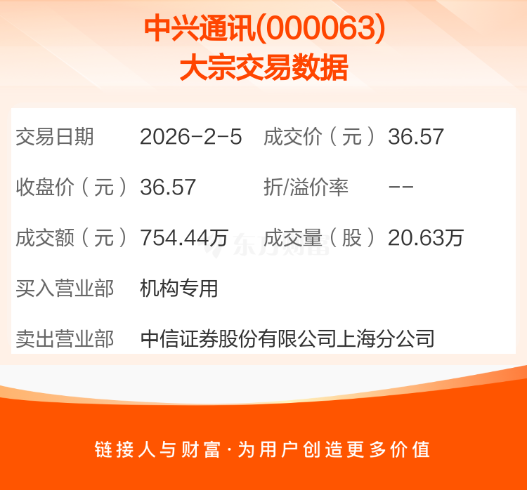 2026年2月5日,中兴通讯发生1笔大宗交易,共成交20.63万股,成交金额754.44万元。