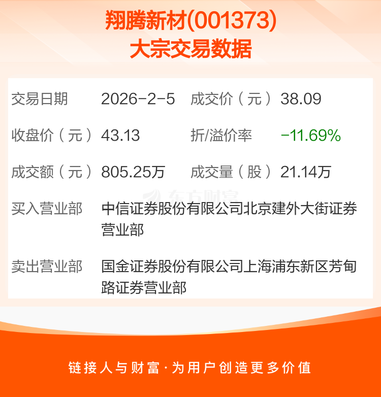 2026年2月5日,翔腾新材发生1笔大宗交易,共成交21.14万股,成交金额805.25万元,占其流通市值比例为0.56%。