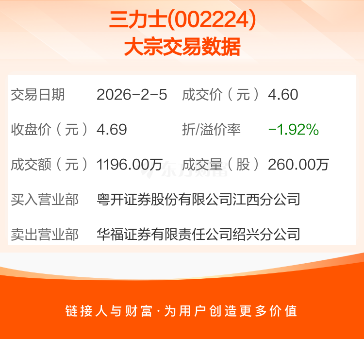2026年2月5日,三力士发生1笔大宗交易,共成交260.00万股,成交金额1196.00万元,占其流通市值比例为0.32%。