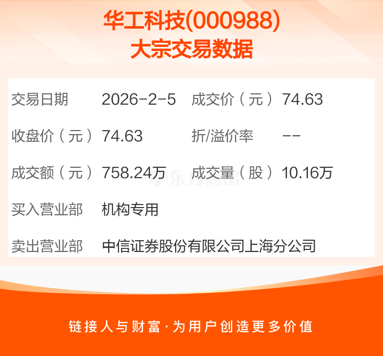 2026年2月5日,华工科技发生1笔大宗交易,共成交10.16万股,成交金额758.24万元,占其流通市值比例为0.01%。