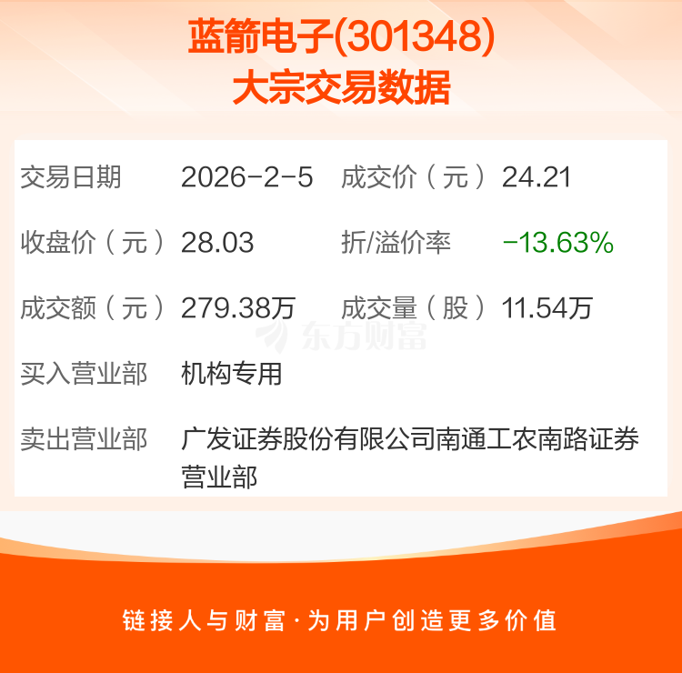 大宗交易:蓝箭电子成交279.38万元,折价13.63%(2-5)