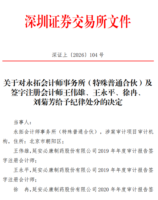 2月4日,深交所发布《关于对永拓会计师事务所(特殊普通合伙)及签字注册会计师王伟雄、王永平、徐冉、刘菊芳给予纪律处分的决定》。根据中国证监会《行政处罚决定书》(〔2025〕113号)查明的事实,永拓所及相关注册会计师在为延安必康制药股份有限公司2019年度和2020年度财务报表提供审计服务过程中,存在未勤勉尽责、出具审计报告存在虚假记载等违规行为。