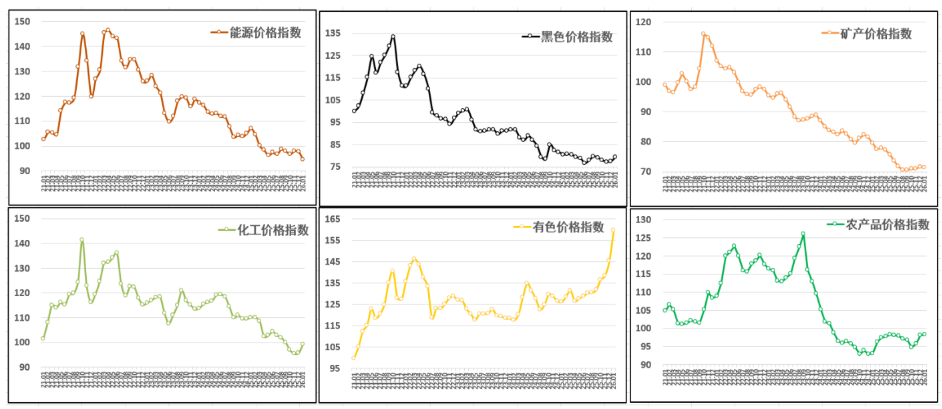分行业看:有色价格指数大幅上涨,报159.6点,月环比上涨9.9%,年同比上涨26.6%;化工价格指数快速上行,报99.3点,月环比上涨3.8%,年同比下跌9.8%;黑色价格指数继续回升,报79.2点,月环比上涨2.2%,年同比下跌1.6%;农产品价格指数小幅走高,报98.3点,月环比上涨0.2%,年同比上涨5.7%;矿产价格指数小幅回落,报71.3点,月环比下跌0.3%,年同比下跌10.3%;能源价格指数弱势下行,报94.6点,月环比下跌3.2%,年同比下跌11.6%。