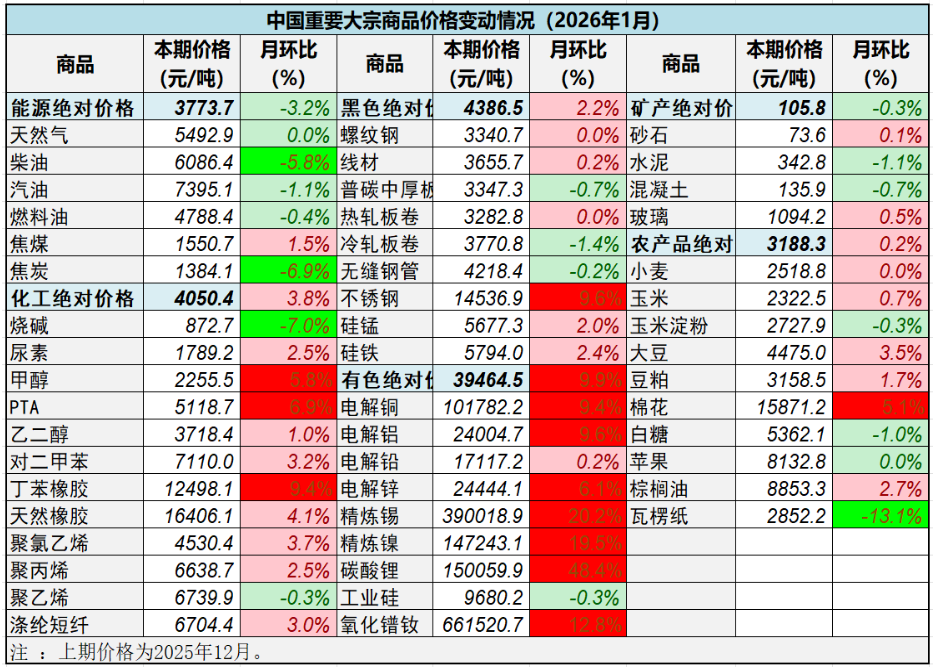 从国内外指数比较看:CBPI与上月PPI、CPI走势基本一致。12月PPI环比上涨0.2%;其中,生产资料价格环比上涨0.3%,生活资料价格环比持平。12月CPI环比上涨0.2%;其中,食品价格环比上涨0.3%、非食品价格环比上涨0.1%。CBPI与CRB、S&P GSCI不同程度上涨。北美、中东地缘政治局势紧张,美元指数走软,国际原油价格普遍上涨,铜价迭创历史新高。1月黄金、白银双创历史新高,但随CME上调保证金及美联储主席提名公布,1月31日,美现货白银价格一度跌超36%,创历史最大日内跌幅;黄金最高跌超12%,创40年来最大单日跌幅。