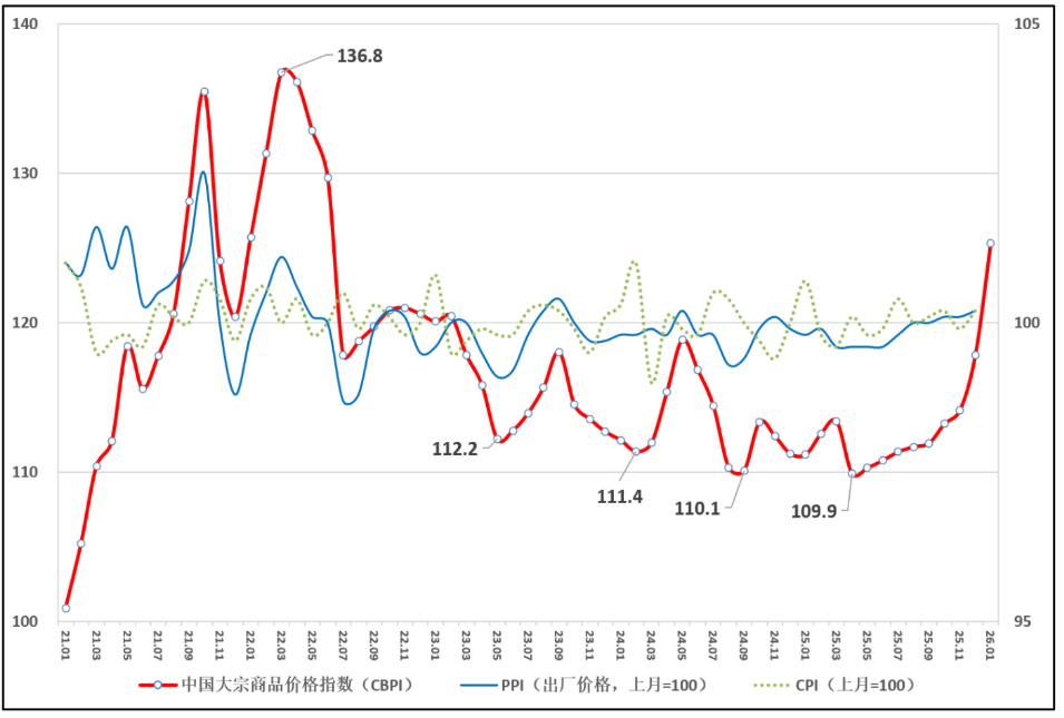 2月5日,由中物联大宗商品流通分会和上海钢联等单位联合调查,中国物流与采购联合会发布的2026年1月份中国大宗商品价格指数(CBPI)为125.3点,环比上涨6.3%,同比上涨12.7%,创2022年7月以来新高。从指数运行情况来看,一方面,随“两重”“两新”政策加力扩围,“反内卷”政策不断深化,企业预期保持乐观,生产活动延续扩张态势,为“十五五”开局奠定良好基础;另一方面,国际地缘政治深刻演变、货币政策宽松预期、以及大宗商品期货价格剧烈波动,带动国内有色、化工等价格快速上涨,亦带来多重挑战。当前国际金融市场动荡明显加大,部分大宗商品上涨过快,需高度重视并加强外部输入性风险研判,加大宏观政策调节力度,维护产业链供应链稳定。