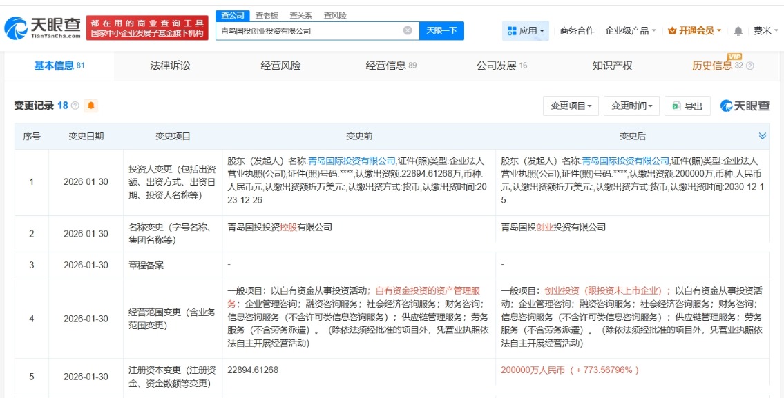 南方财经2月5日电,天眼查App显示,近日,青岛国投投资控股有限公司发生工商变更,企业名称变更为青岛国投创业投资有限公司,同时,注册资本由约2.29亿人民币增至20亿人民币,增幅约774%。该公司成立于2015年10月,法定代表人为陈创序,经营范围包括创业投资、以自有资金从事投资活动、企业管理咨询、融资咨询服务等,由青岛国际投资有限公司全资持股。