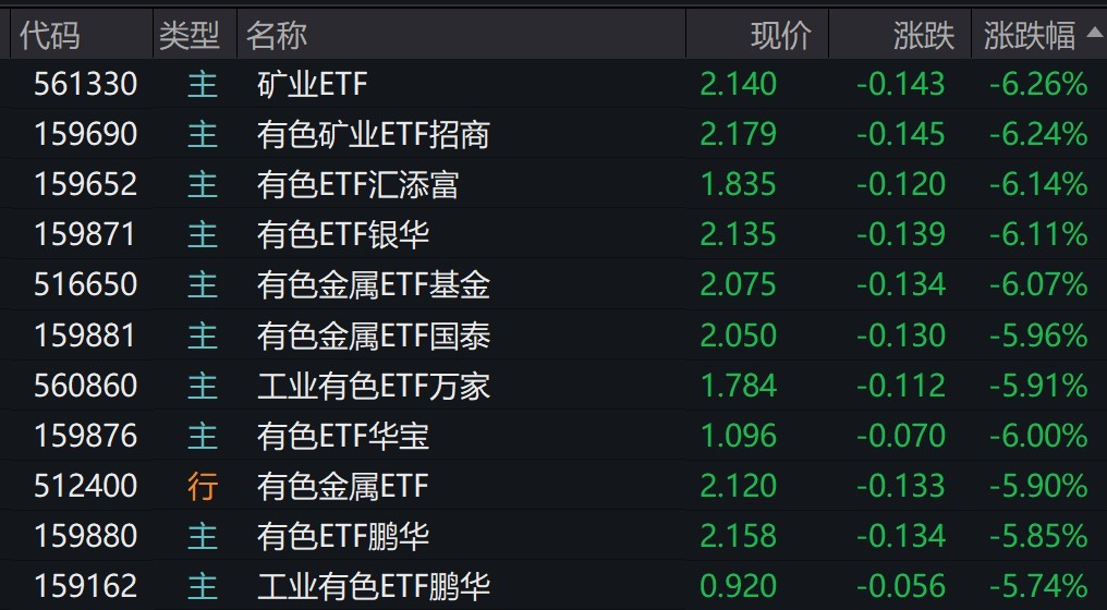 受盘面影响,矿业、有色相关ETF跌约6%。