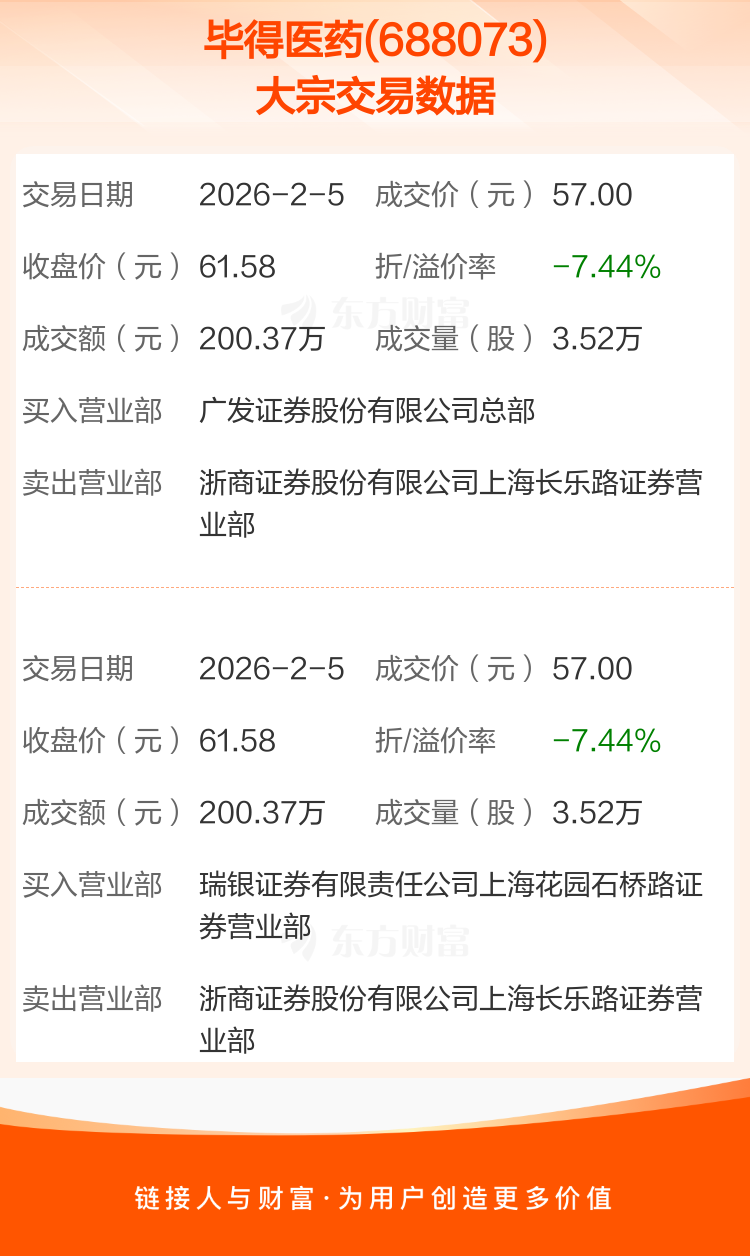 2026年2月5日,毕得医药发生2笔大宗交易,共成交7.04万股,成交金额400.74万元,占其流通市值比例为0.15%。