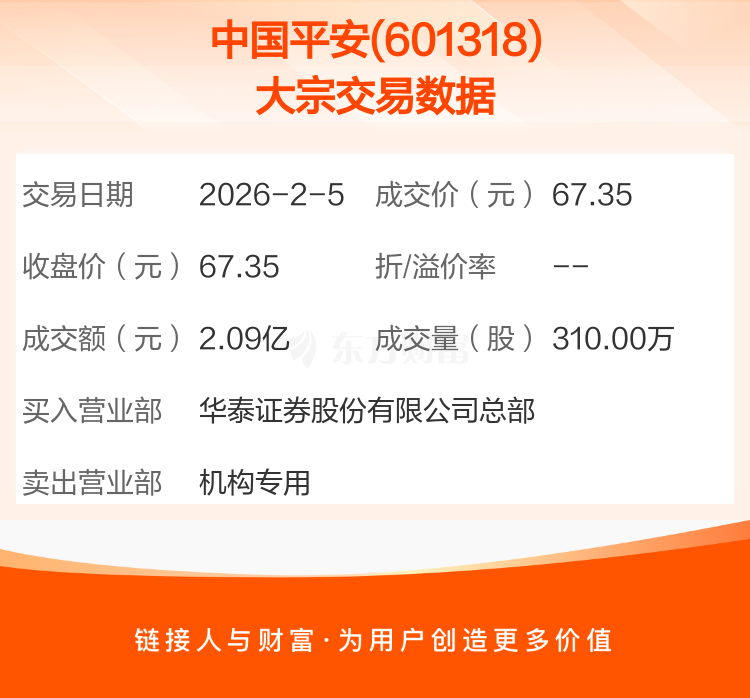 2026年2月5日,中国平安发生1笔大宗交易,共成交310.00万股,成交金额2.09亿元,占其流通市值比例为0.03%。