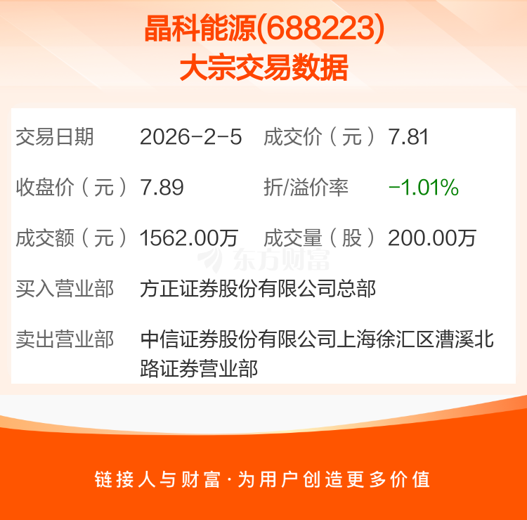 2026年2月5日,晶科能源发生1笔大宗交易,共成交200.00万股,成交金额1562.00万元,占其流通市值比例为0.02%。