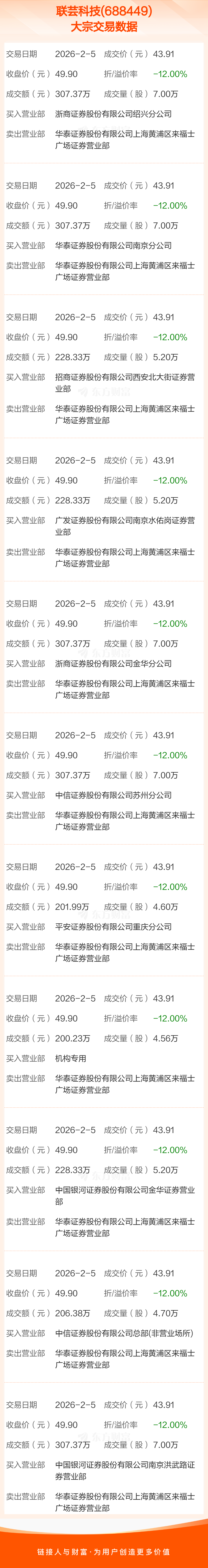 2026年2月5日,联芸科技发生11笔大宗交易,共成交64.46万股,成交金额2830.44万元,占其流通市值比例为0.19%。