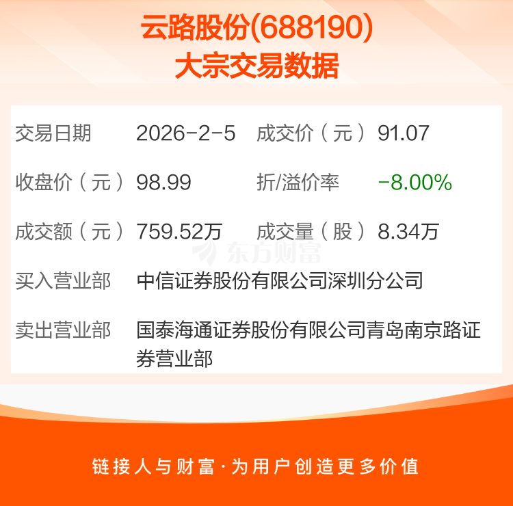 2026年2月5日,云路股份发生1笔大宗交易,共成交8.34万股,成交金额759.52万元,占其流通市值比例为0.06%。