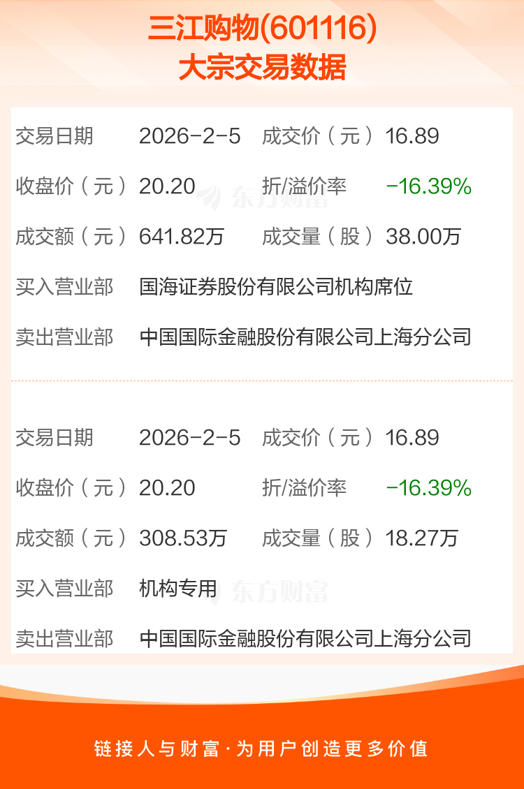 2026年2月5日,三江购物发生2笔大宗交易,共成交56.27万股,成交金额950.35万元,占其流通市值比例为0.09%。