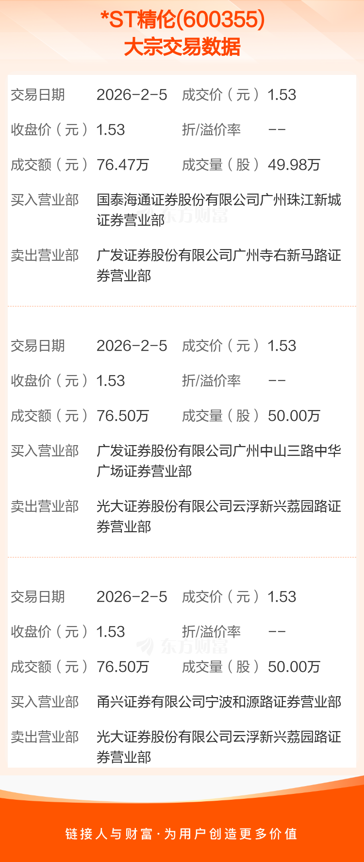 2026年2月5日,*ST精伦发生3笔大宗交易,共成交149.98万股,成交金额229.47万元,占其流通市值比例为0.30%。