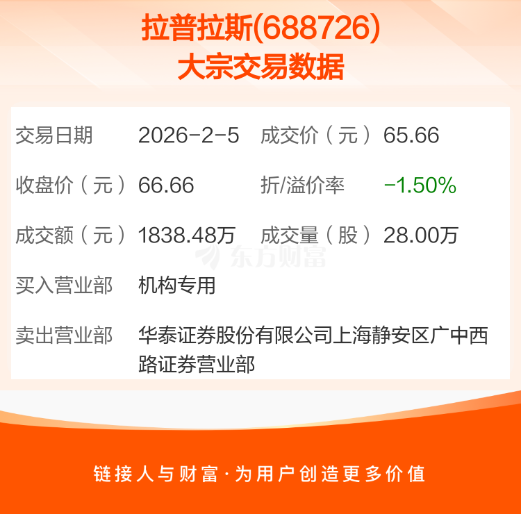 2026年2月5日,拉普拉斯发生1笔大宗交易,共成交28.00万股,成交金额1838.48万元,占其流通市值比例为0.13%。