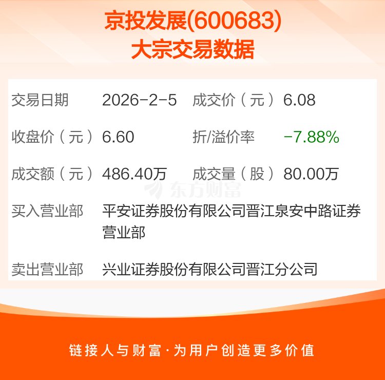 2026年2月5日,京投发展发生1笔大宗交易,共成交80.00万股,成交金额486.40万元,占其流通市值比例为0.10%。