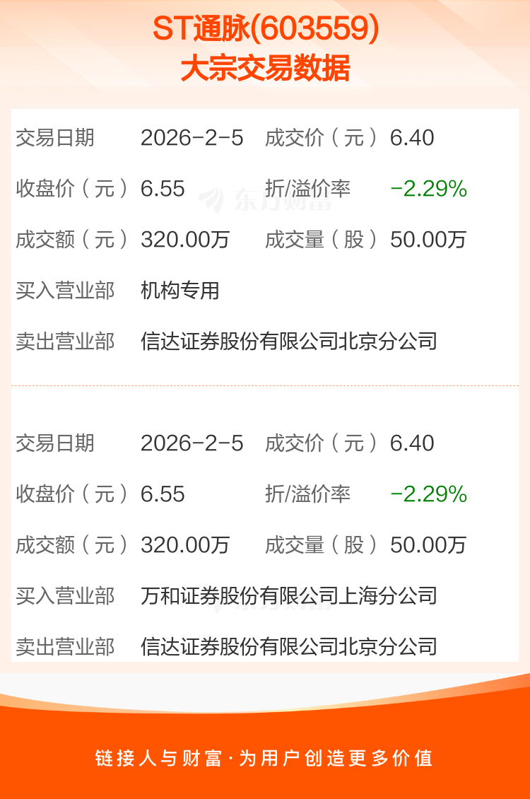 2026年2月5日,ST通脉发生2笔大宗交易,共成交100.00万股,成交金额640.00万元,占其流通市值比例为0.24%。