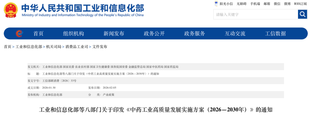 【导读】工业和信息化部等八部门印发《中药工业高质量发展实施方案(2026—2030年)》