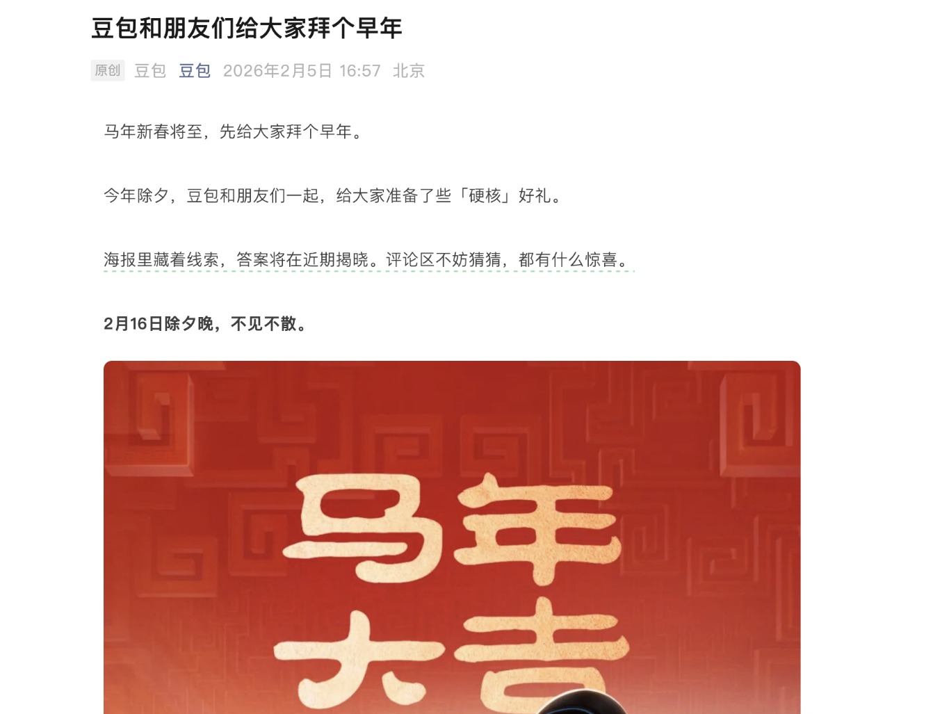 2月5日,字节跳动豆包官方在其公众号发文称,今年除夕,豆包和朋友们一起,给大家准备了些“硬核”好礼。豆包表示,海报里藏着线索,答案将在近期揭晓。文中附带多个红包封面图片。
