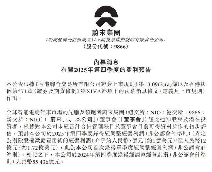 消息面上,蔚来盘后在港交所公告,预计公司于2025年第四季度录得经调整经营利润(非公认会计准则)(界定为剔除股权激励费用后的经营利润)介乎约人民币7亿元(约1亿美元)至人民币12亿元(约1.72亿美元),此为公司首次录得单季度经调整经营利润(非公认会计准则)。