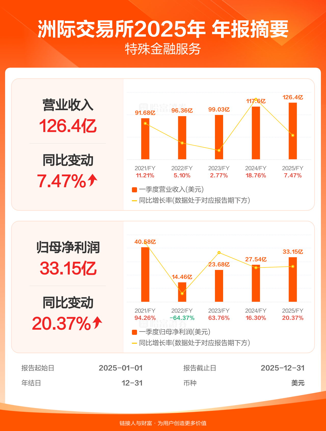洲际交易所2月5日发布年报业绩,截至2025年12月31日的12个月内,该公司营业收入126.40亿美元,同比增长7.47%;公司权益持有人应占溢利(归母净利润)33.15亿美元,同比增长20.37%。