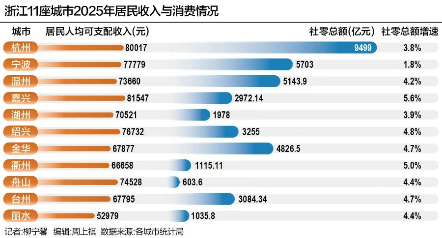 21世纪经济报道梳理发现,浙江居民人均收入领先全国,但城市之间消费节奏出现分化。2025年,浙江“整体富”的特征更加明显,除丽水外,10座城市居民人均收入在6.5万元以上,同期全国居民可支配收入为4.3万元。收入基础扎实,这是浙江消费持续扩容的基础条件。
