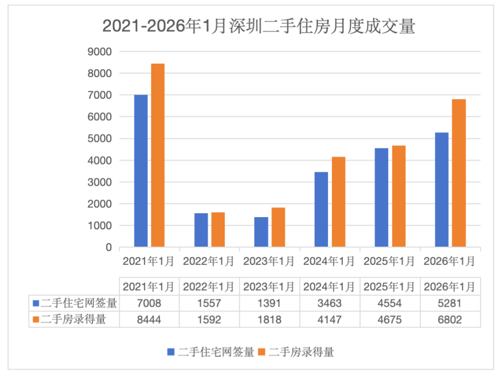 据深圳市房地产中介协会统计数据,2026年1月,深圳二手房共计录得6802套,环比增长2.9%,同比大幅增长45.5%,创近10个月新高。