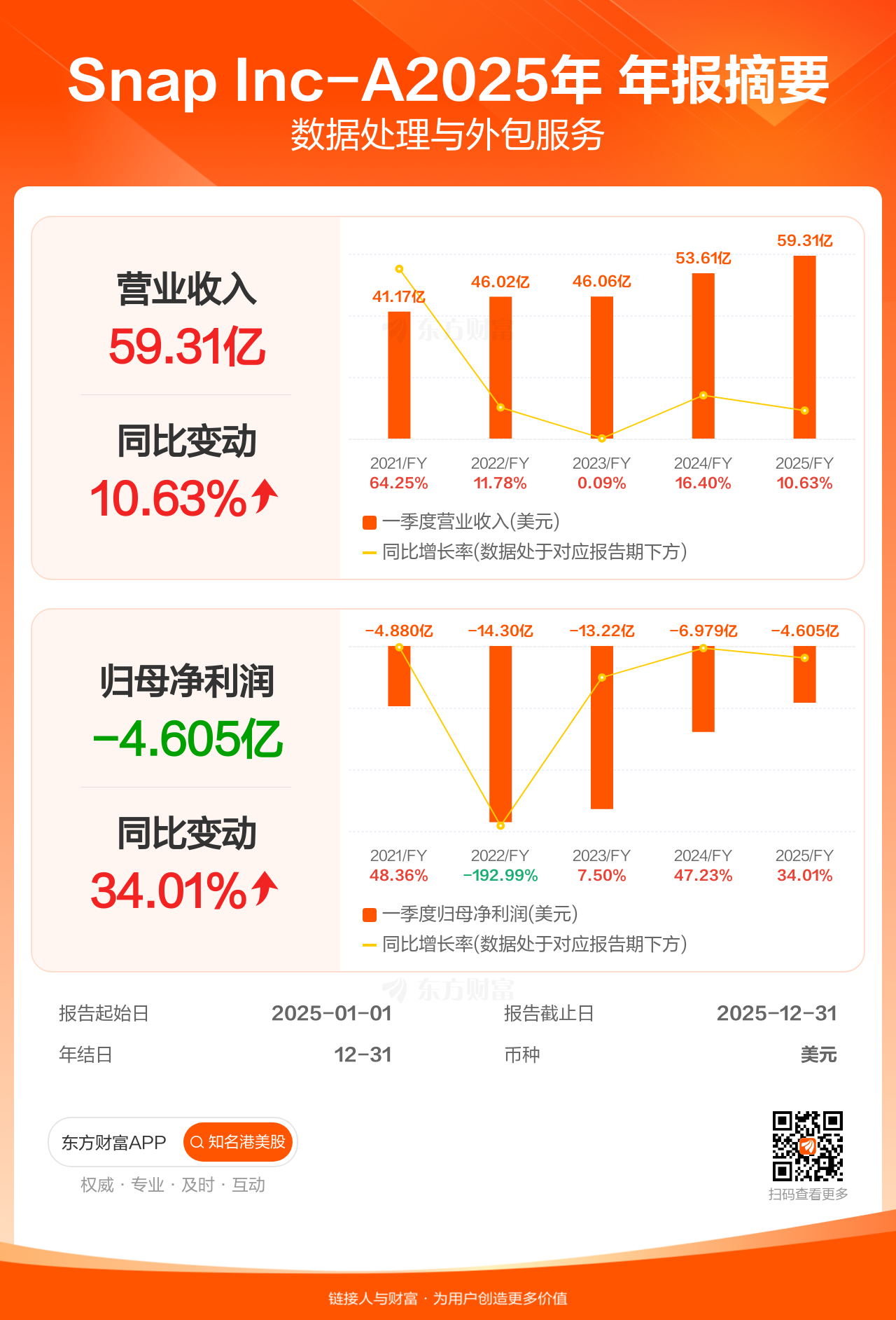 Snap Inc-A2月4日发布年报业绩,截至2025年12月31日的12个月内,该公司营业收入59.31亿美元,同比增长10.63%;公司权益持有人应占溢利(归母净利润)-4.60亿美元,上年同期-6.98亿美元。
