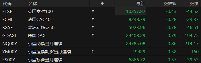 周四盘前,美股三大股指期货齐跌,欧洲主要指数普遍下跌。截至发稿,纳斯达克100指数期货跌0.86%,道指期货跌0.32%,标普500指数期货跌0.57%。